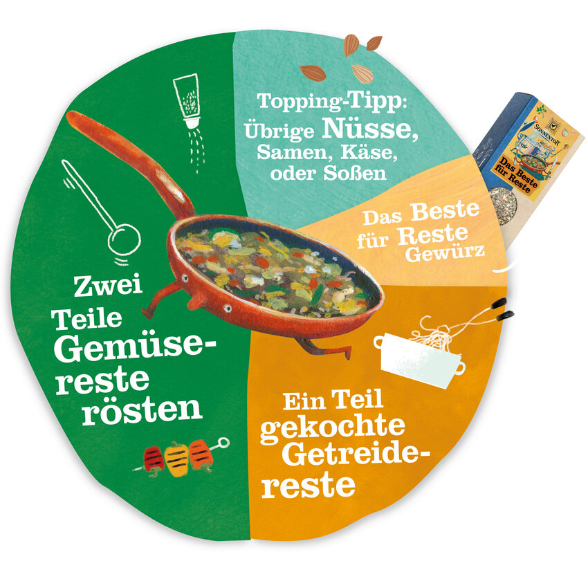 Besonders einfach und schnell, lässt sich sich unser "Restlos gücklich Gericht" zubereiten. Die Zutaten kannst du selbst wählen. Genaue Rezeptangaben suchst du hier vergebens, denn egal wie oft du dieses Gericht zubereitest, du kannst es immer wieder neu erfinden. Höre einfach auf deine Intuition. Das übrig gebliebene Gemüse wird wahrscheinlich stark von der Saison abhängen. Hier ist unser Motto: je bunter - desto besser. Beim Getreide kannst du deiner Kreativität auch freien Lauf lassen. Ob Reis, Hirse, Erdäpfel oder Nudeln - einfach ausprobieren und genießen. Das Beste für Reste bringt die nötige Würze und auch beim Topping gilt: Reste zuerst. So passen z.B. auch Nüsse und Samen sensationell zu pikanten Speisen. Iss dich restlos glücklich.